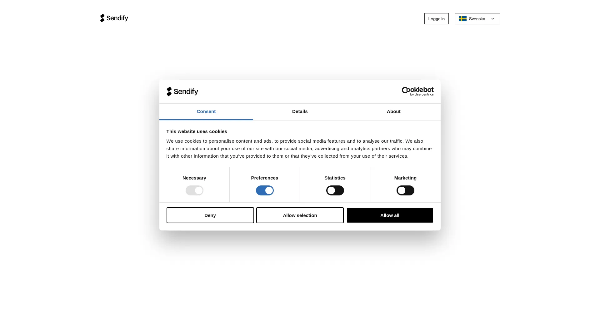 El sitio web implementa mecanismos de consentimiento de cookies en cumplimiento con regulaciones de privacidad como GDPR o CCPA. Esto demuestra que web.sendify.se adhiere a estándares de protección de datos y proporciona a los usuarios control sobre prácticas de recolección de datos personales.