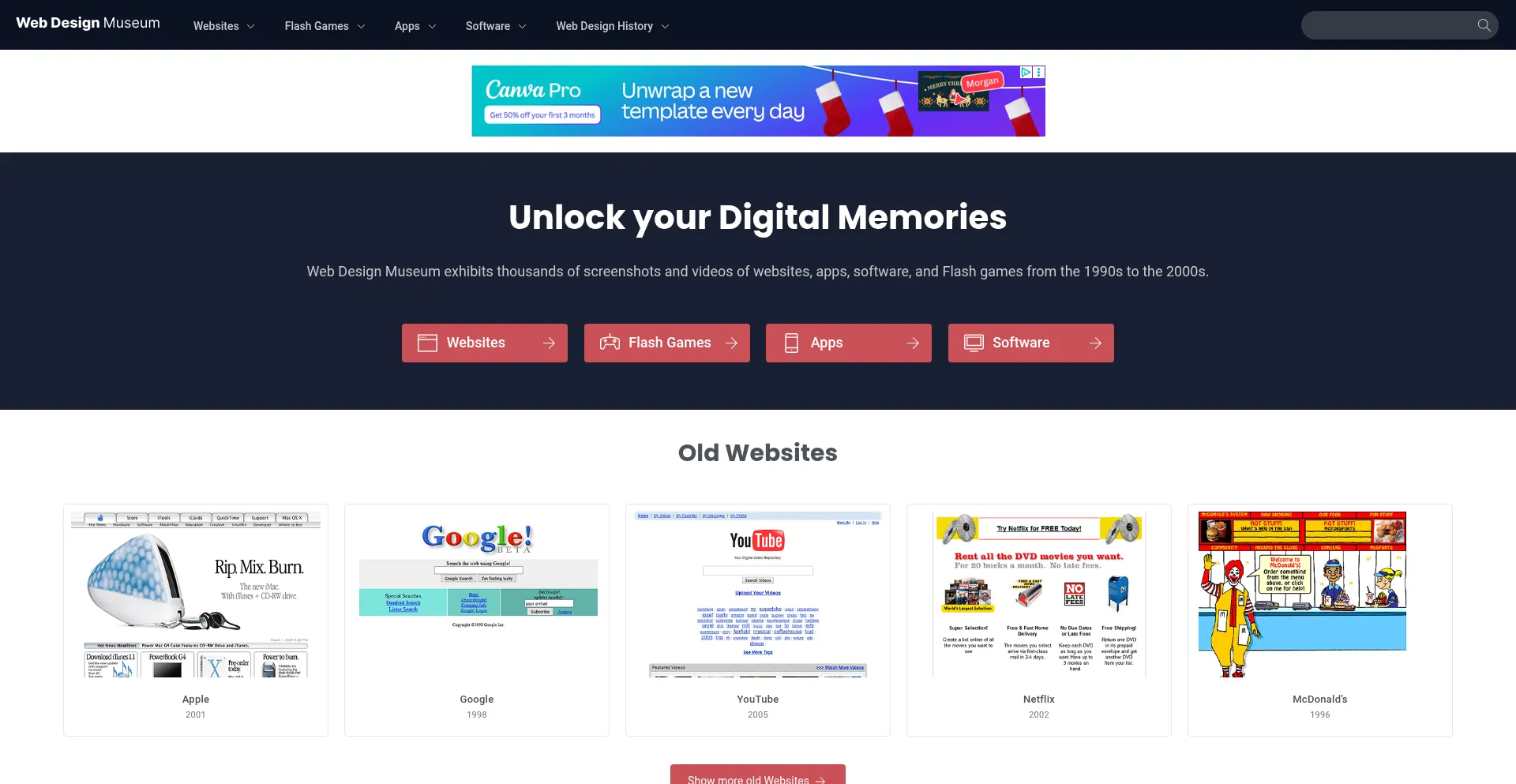 Web Design Museum exhibits thousands of screenshots and videos of websites, apps, software, and Flash games from the 1990s to the 2000s.