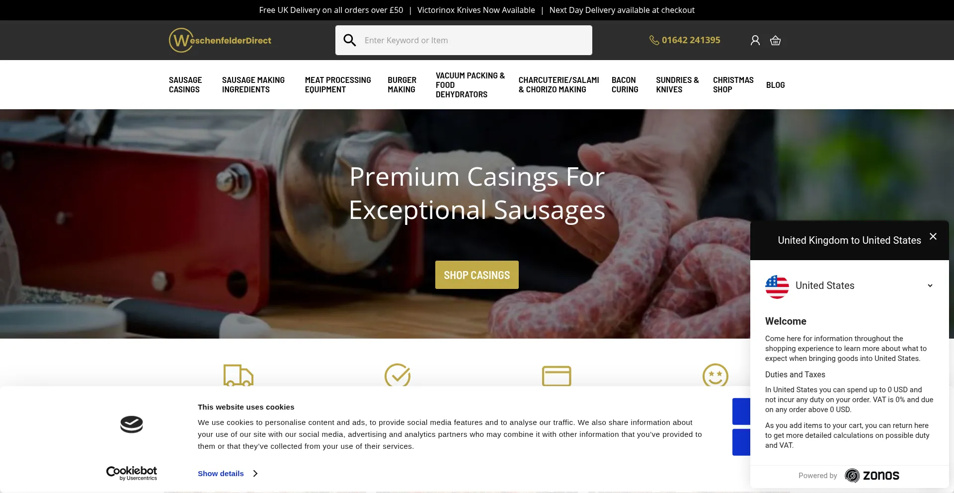 Sausage-making equipment and ingredients including sausage stuffers, natural and collagen casings, mixes, rusk and seasonings.