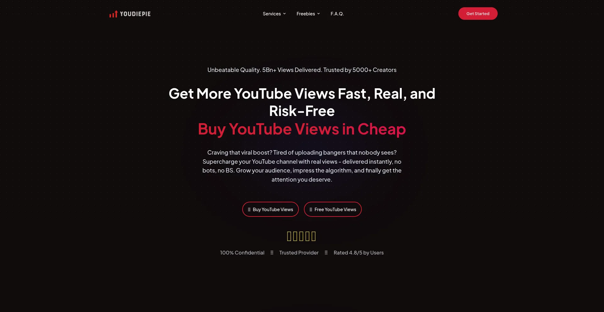 Don’t ruin your channel with low engagement and fake views. Youdiepie brings you 100% real views for your channel, guaranteed.