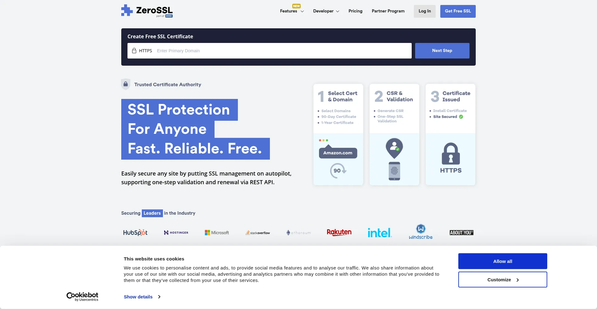 Free SSL certificates issued instantly online, supporting ACME clients, SSL monitoring, quick validation and automated SSL renewal via ZeroSSL Bot or REST API.