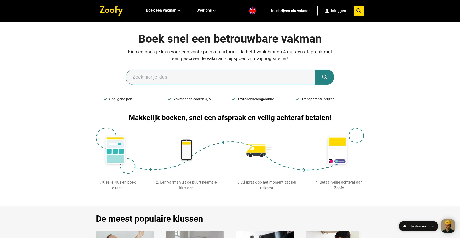 Boek online een klus en kies zelf de datum en tijd. Een betrouwbare vakman uit de buurt pakt de klus snel op. Via Zoofy krijg je garantie en betaal je achteraf!
